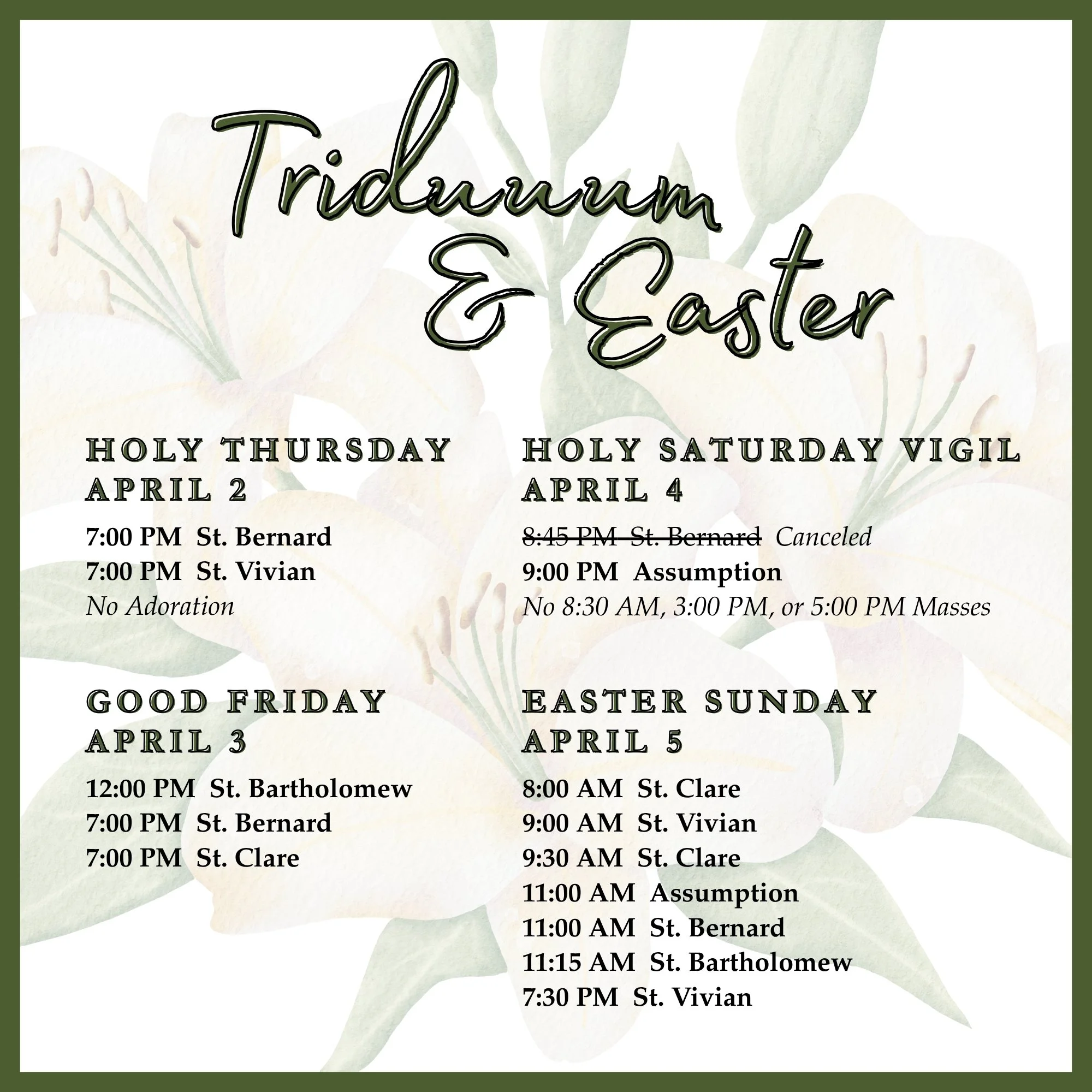 Please note that the Family of Parishes Offices are CLOSED Thursday, April 2 through Monday, April 6 in honor of the Triduum & Easter. We will reopen with normal hours on Tuesday, April 7.