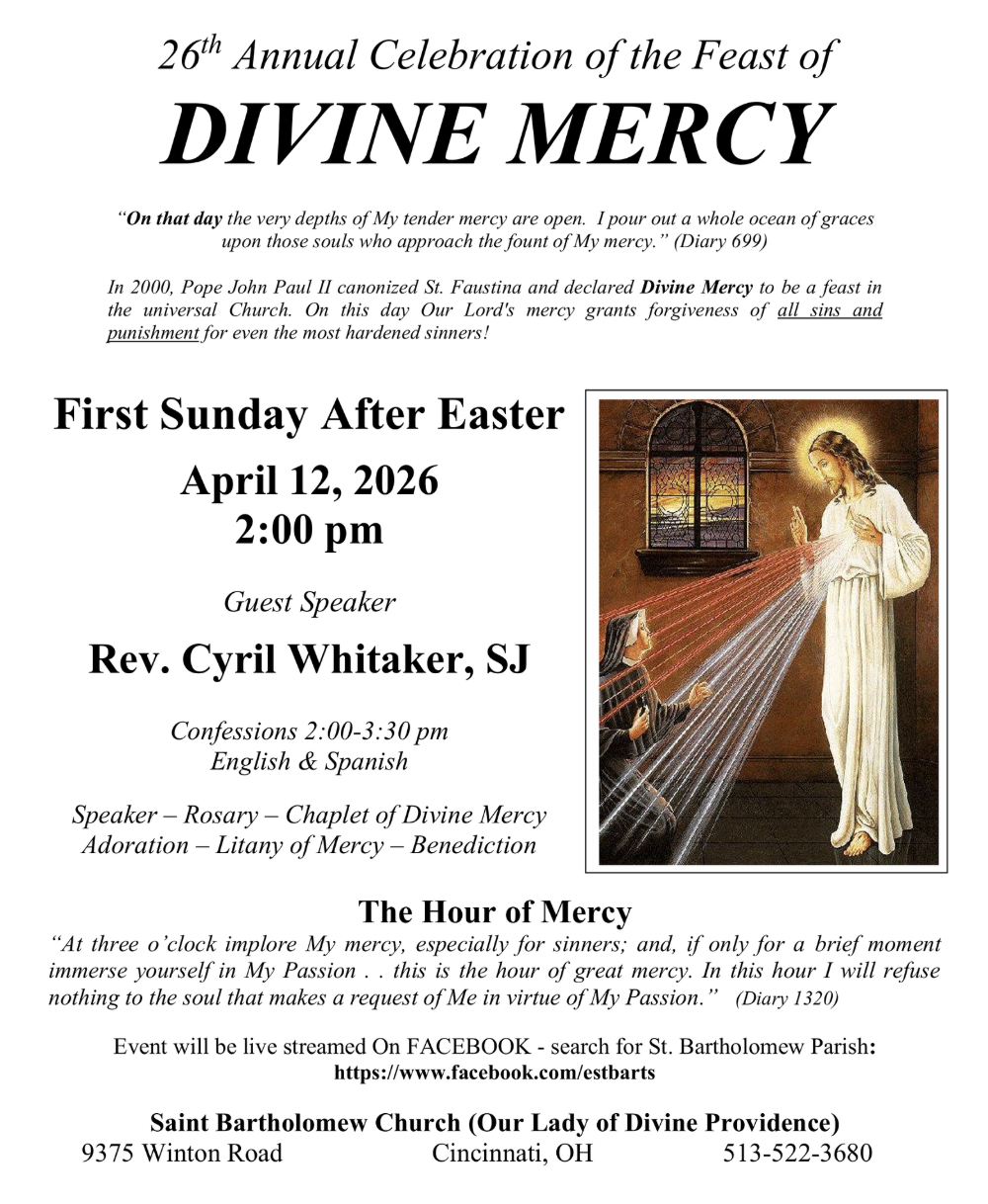 On Divine Mercy Sunday, it is a tradition within our Family of Parishes to host a great celebration of Divine Mercy, with many confessions, at the St. Bartholomew campus. Please take advantage of this great opportunity! See the advertisement below for more details.