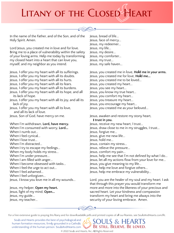 Below is the Litany of the Closed Heart. I would encourage you to read it, to pray it, and to find freedom in the opening of your heart.