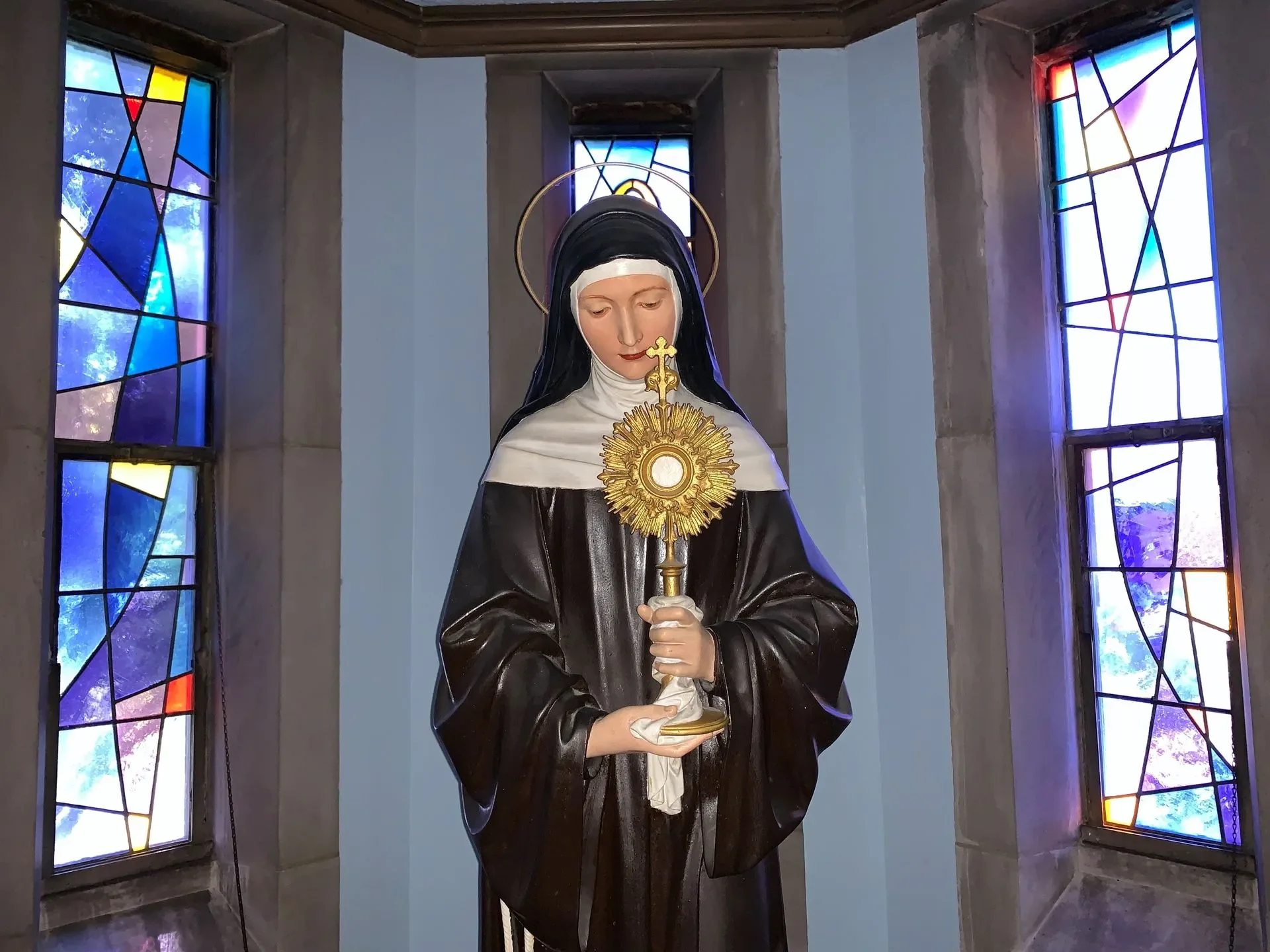 As in her life, St. Clare devoutly holds the monstrance with the Blessed Sacrament in protection of the monastery. At her feet are cats, symbolizing the contemplative life. Consistent with Franciscan love of nature, a sparrow nests in the colonnade, “Even the sparrow has found a home ... where she may have her young – a place near your altar, O Lord Almighty, my King and my God.” (Psalm 84:3)